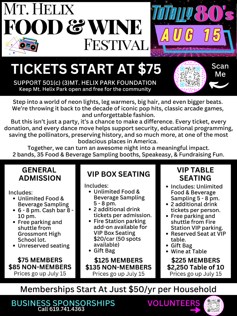 Preps, Jocks, Cheerleaders, Nerds, Punks, New Wavers, Metalheads, and Valley Girls are all welcome at Mt. Helix Park. So channel that inner MTV icon, Ferris Bueller, Breakfast Club, or Fast Times at Ridgemont High, and get ready for a totally tubular time. 🕺✨